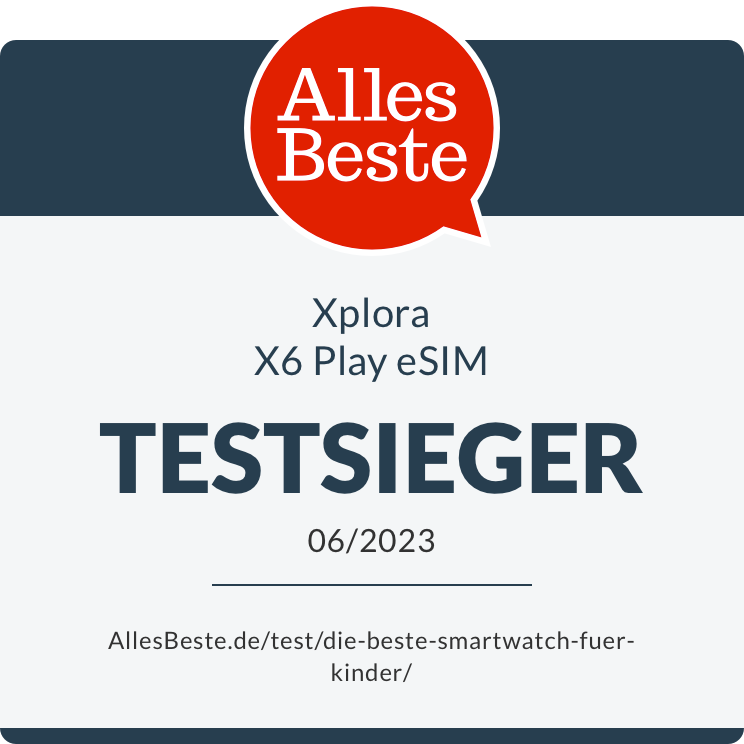 Die Xplora X6 Play eSIM hat in mehreren Tests als die beste Wahl unter den getesteten Kids Watches abgeschnitten. Für die RedakteurInnen des Testmagazins „AllesBeste“ ist sie nach einem Vergleich mit 34 Konkurrenten die alleinige Nummer 1: Gelobt wurden unter anderem die hochwertige Verarbeitung, die leichte Inbetriebnahme und die Zuverlässigkeit der Funktionen.